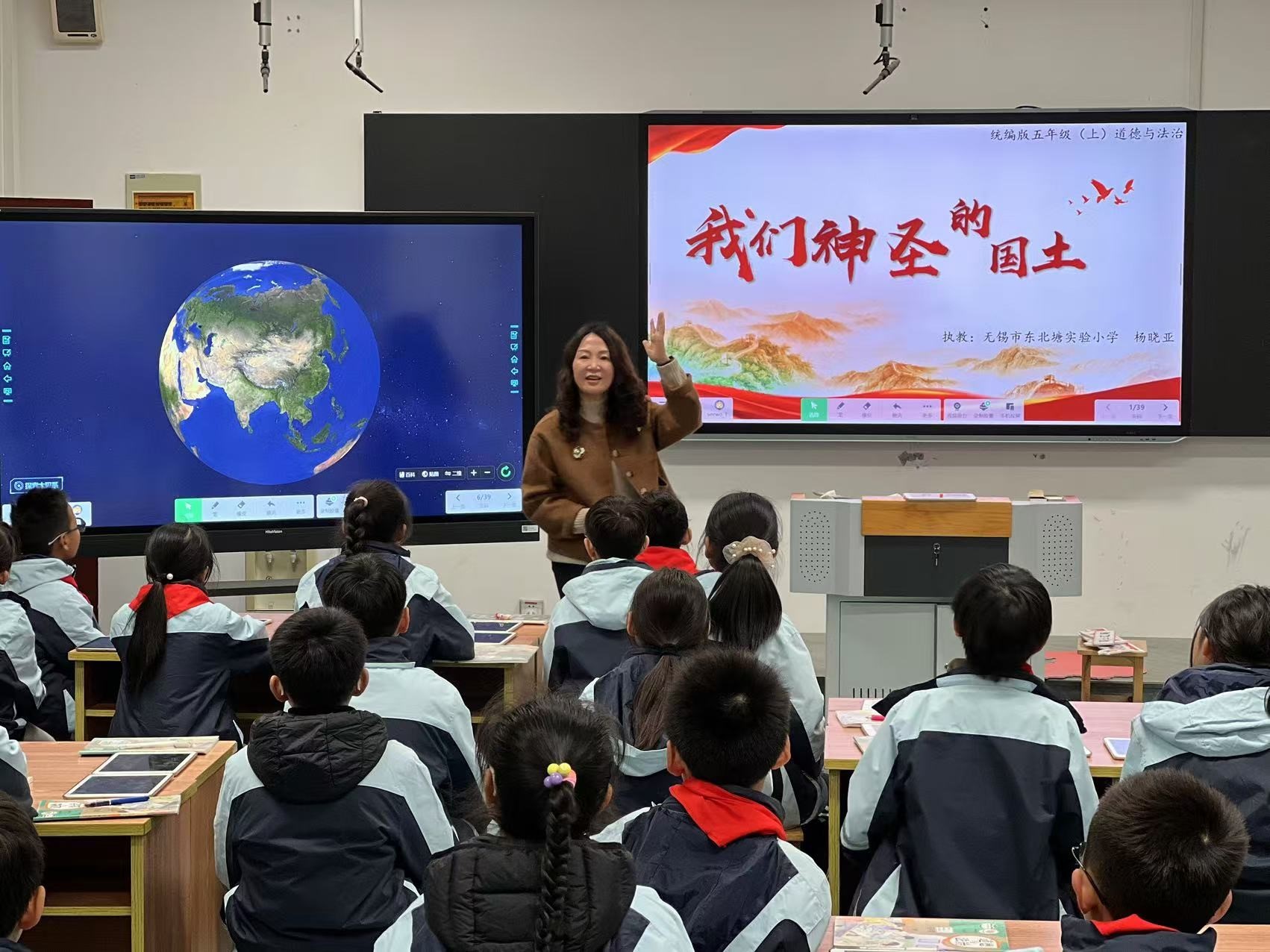 “设计学习院”团队成员、学校党总支书记杨晓亚执教了五年级道德与法治课《我们神圣的国土》。课上,杨晓亚书记巧妙融合多学科知识,为学生开启一场别出心裁的学习之旅。课堂围绕“地理位置我会找”“国土辽阔我会说”“旅游攻略我会做”“国土神圣我牢记”四个任务群渐次展开,抽丝剥茧般引领学生领略祖国山河的广袤无垠。尤其在制定 “旅游攻略” 时,杨书记顺势将台湾地区的风土人情融入其中,巧妙激发学生深沉炽热的爱国情怀,让 “国土神圣不可侵犯” 的理念根植学生心间。整堂课,杨书记充分借助文小言、剪映、全景课堂等前沿 AI 信息化技术,精心营造真实可感的学习情境,引导学生自主解决问题,精准对接新课标核心素养目标,最终回归道德与法治学科育人本位。